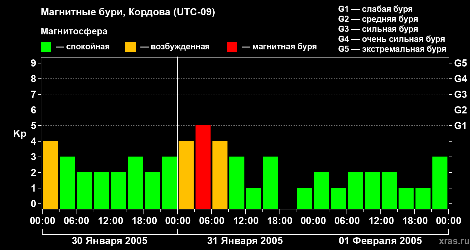 Изменения геомагнитного индекса Kp с 30 января по 1 февраля 2005 года для средних широт