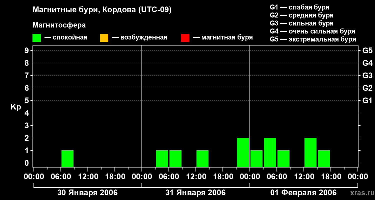 Изменения геомагнитного индекса Kp с 30 января по 1 февраля 2006 года для средних широт