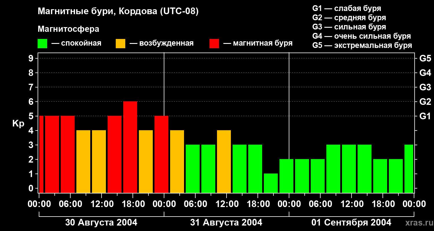 Изменения геомагнитного индекса Kp с 30 августа по 1 сентября 2004 года для средних широт