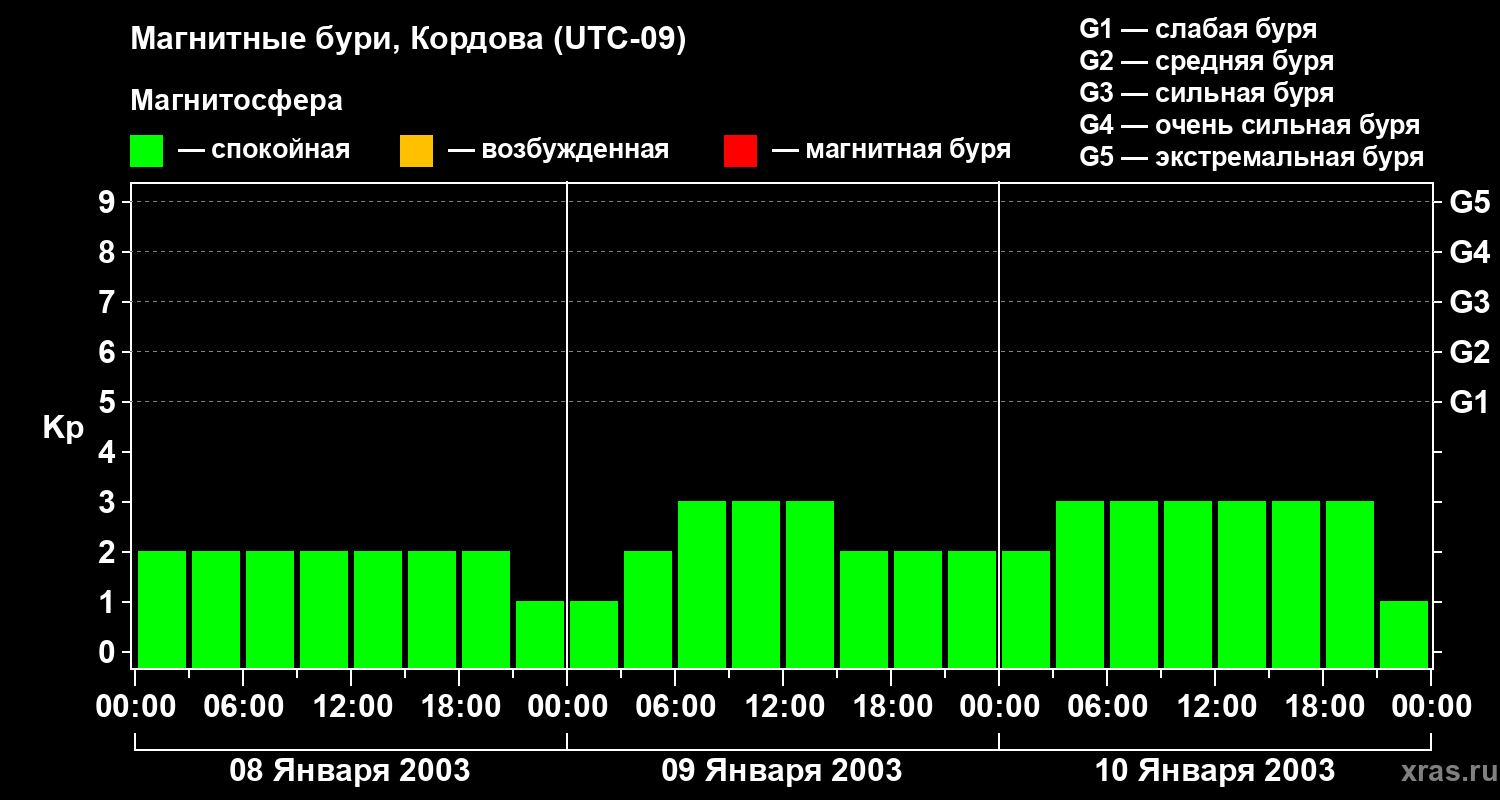 Изменения геомагнитного индекса Kp с 8 по 10 января 2003 года для средних широт