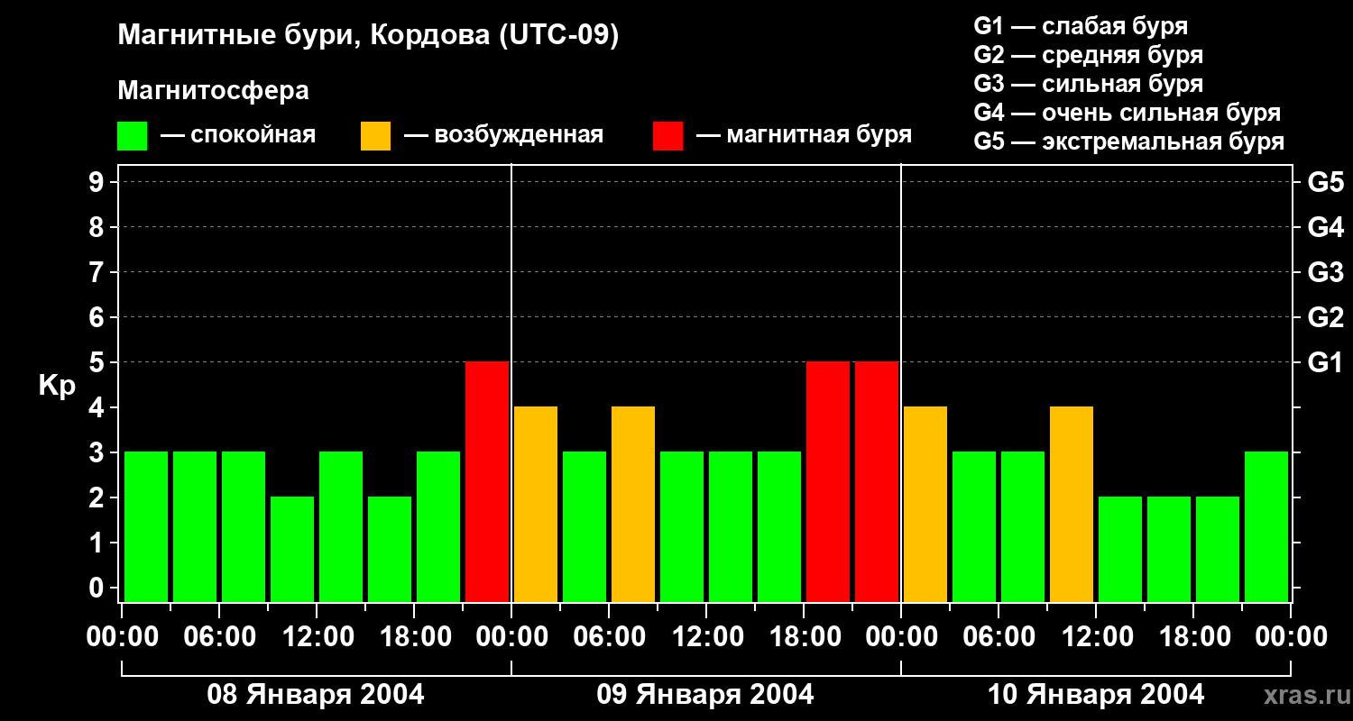 Изменения геомагнитного индекса Kp с 8 по 10 января 2004 года для средних широт