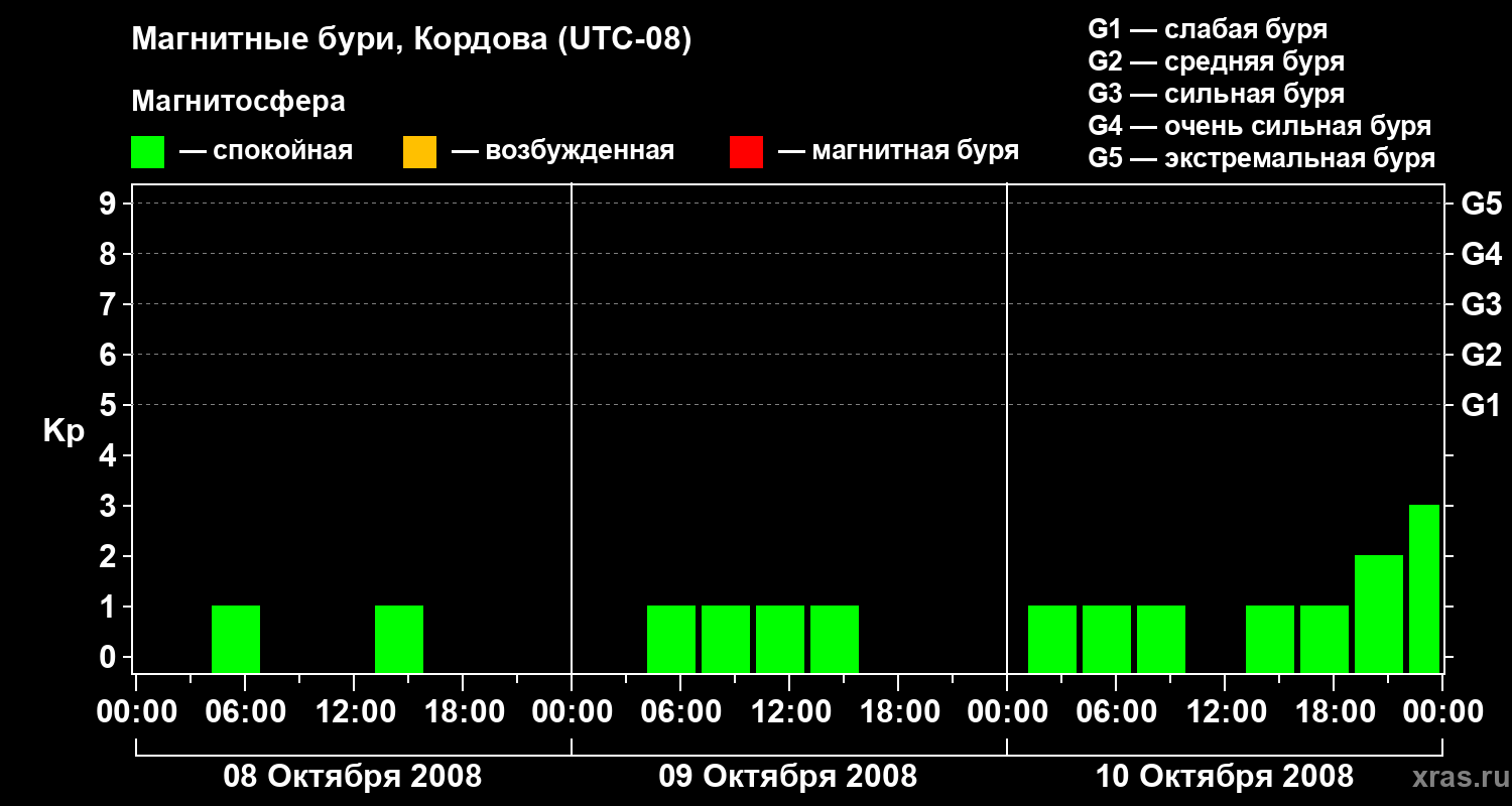 Изменения геомагнитного индекса Kp с 8 по 10 октября 2008 года для средних широт