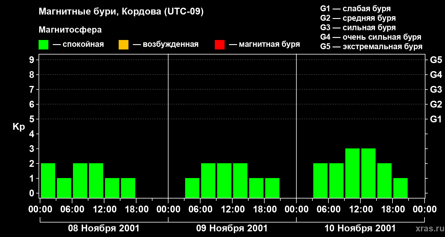 Изменения геомагнитного индекса Kp с 8 по 10 ноября 2001 года для средних широт