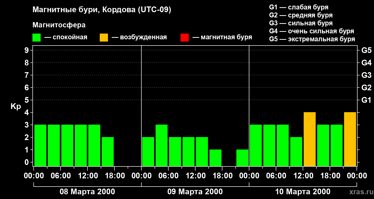 Изменения геомагнитного индекса Kp с 8 по 10 марта 2000 года для средних широт