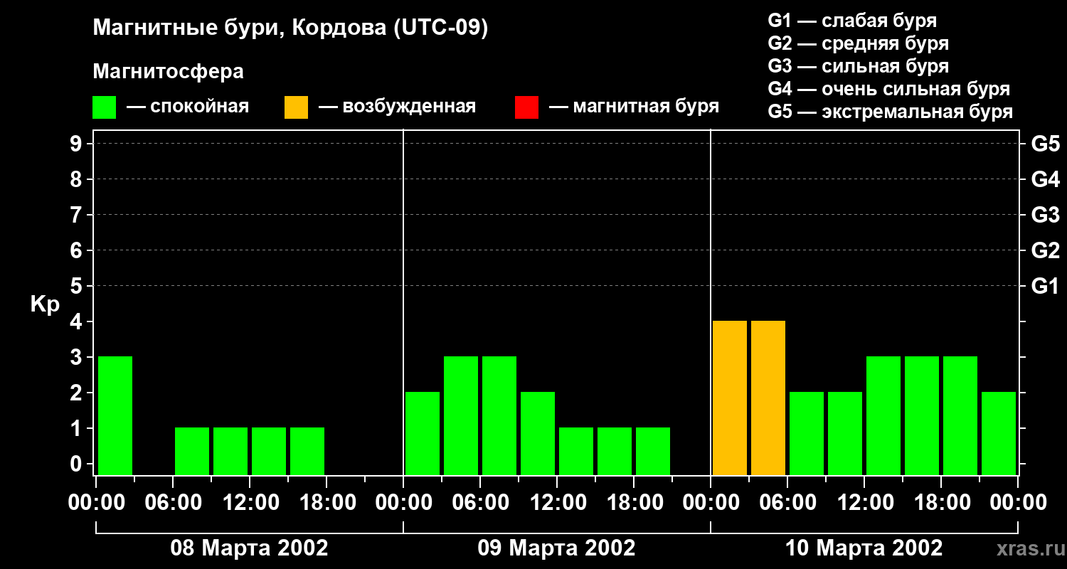 Изменения геомагнитного индекса Kp с 8 по 10 марта 2002 года для средних широт