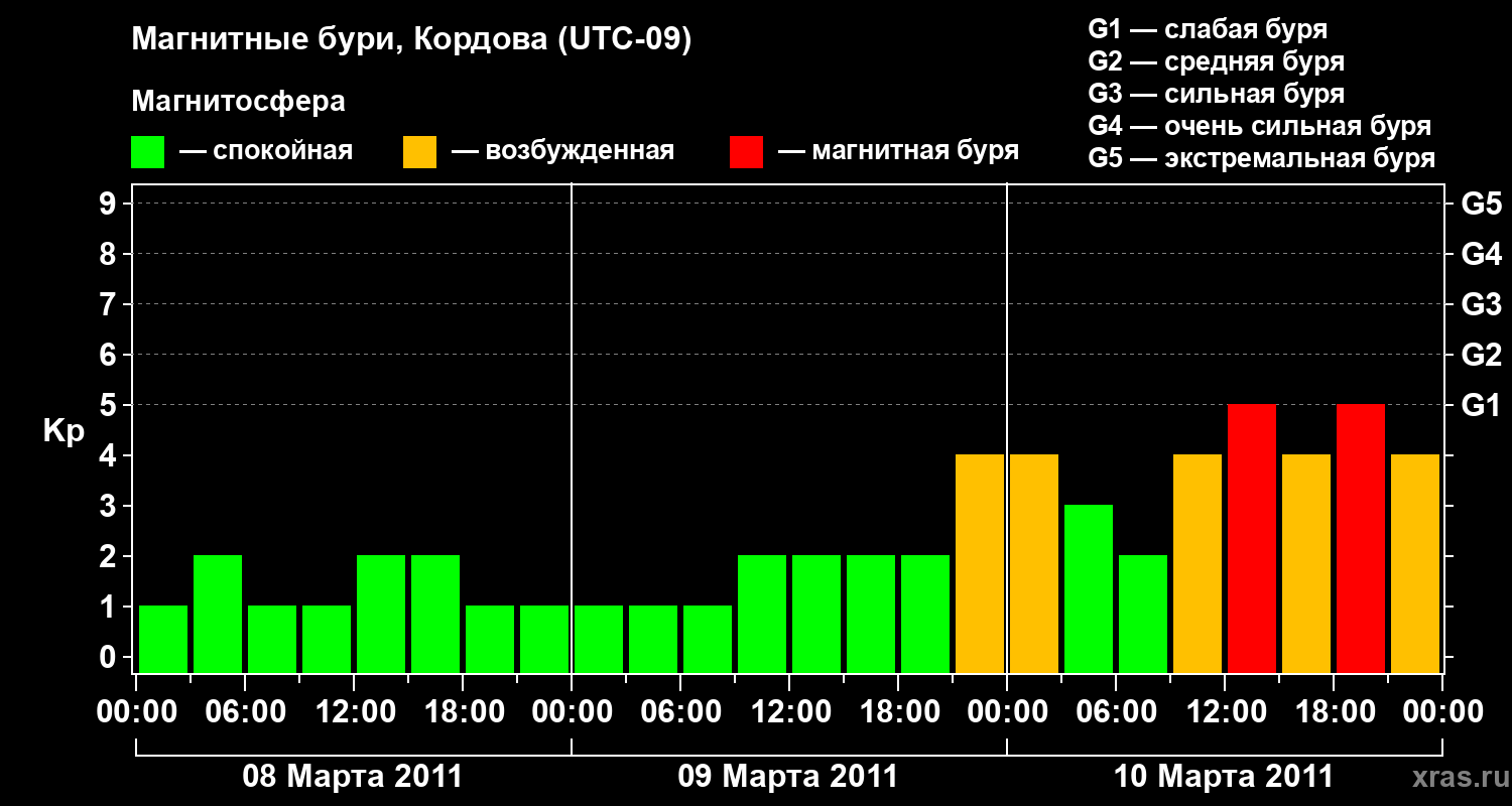 Изменения геомагнитного индекса Kp с 8 по 10 марта 2011 года для средних широт