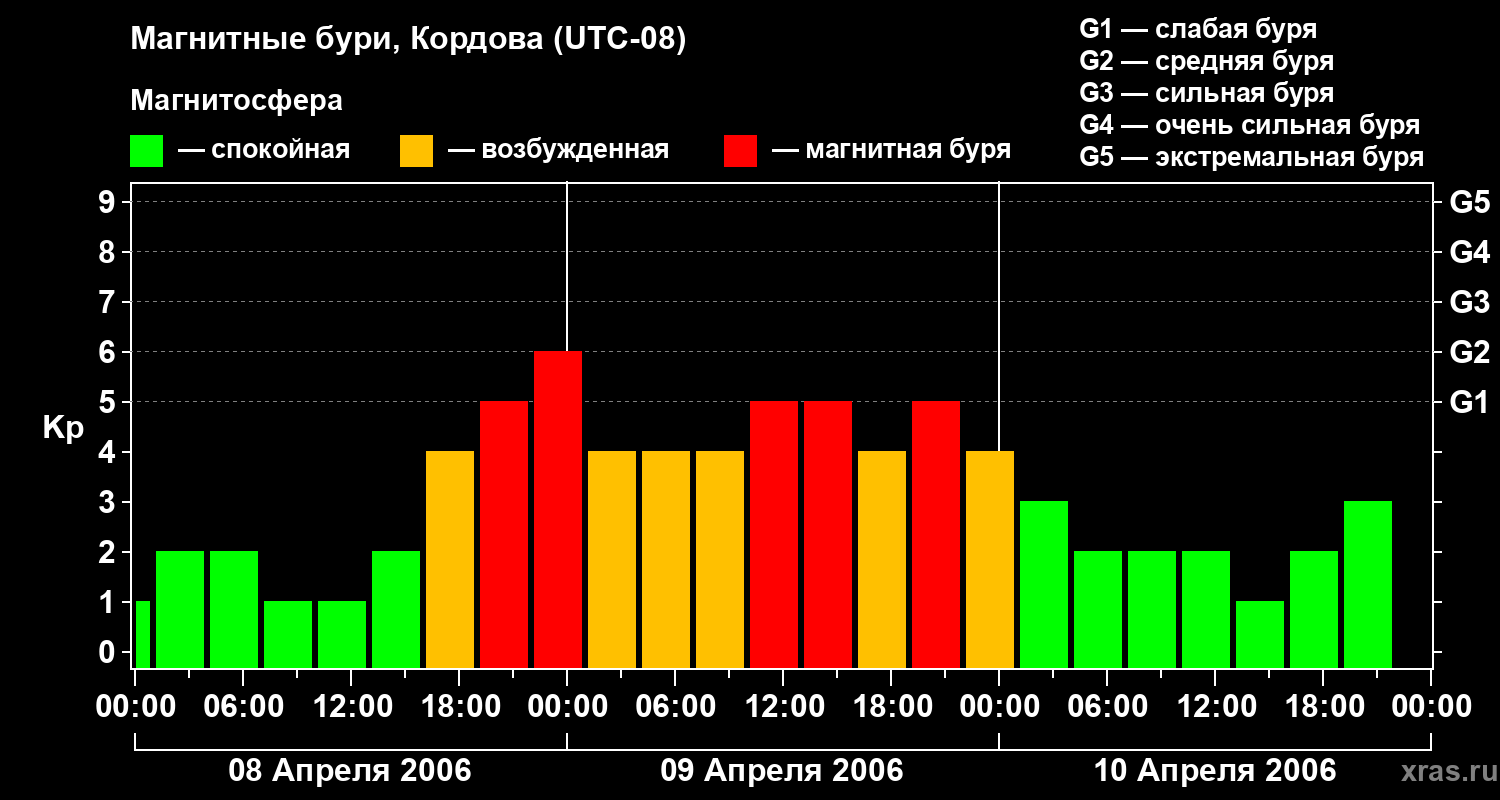 Изменения геомагнитного индекса Kp с 8 по 10 апреля 2006 года для средних широт