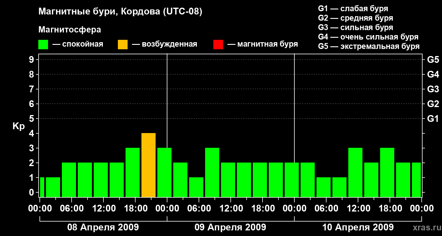 Изменения геомагнитного индекса Kp с 8 по 10 апреля 2009 года для средних широт