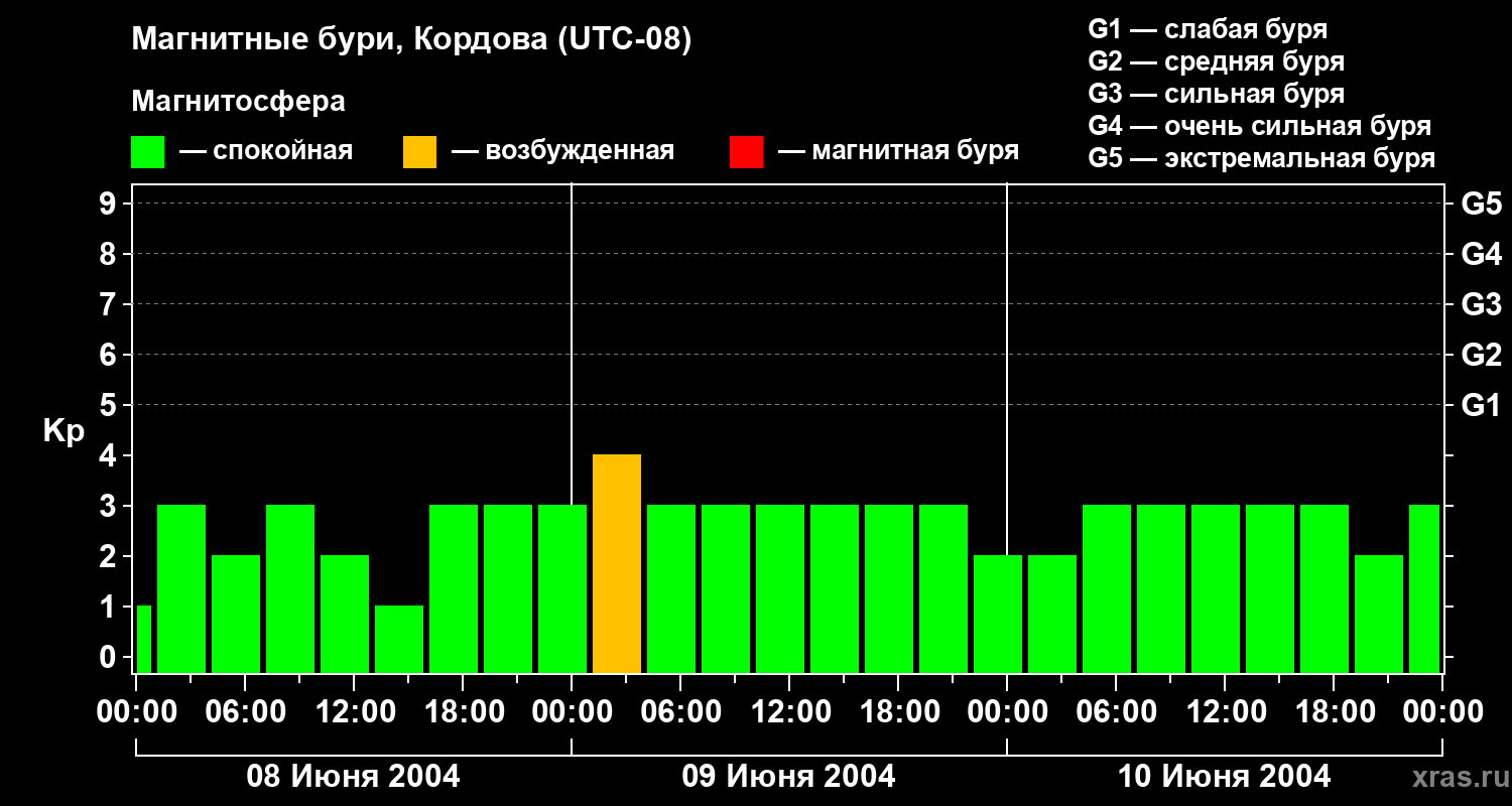 Изменения геомагнитного индекса Kp с 8 по 10 июня 2004 года для средних широт