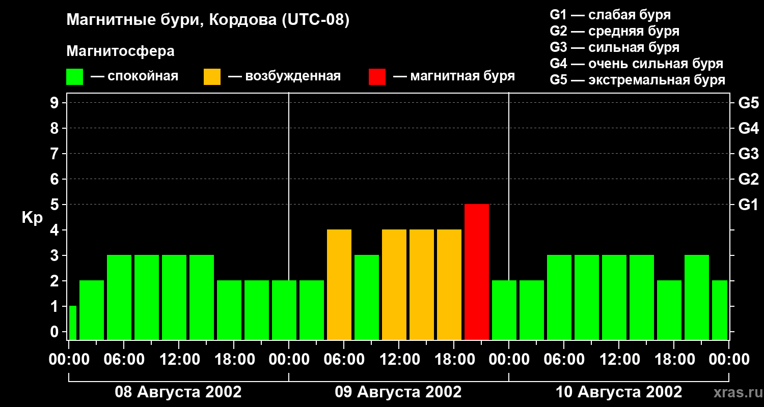 Изменения геомагнитного индекса Kp с 8 по 10 августа 2002 года для средних широт