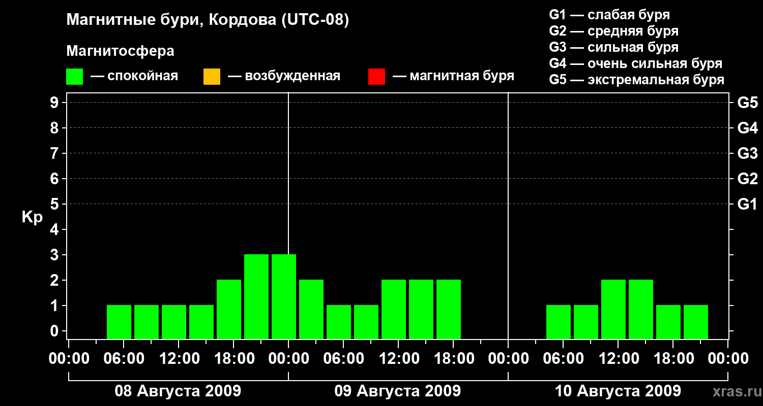 Изменения геомагнитного индекса Kp с 8 по 10 августа 2009 года для средних широт