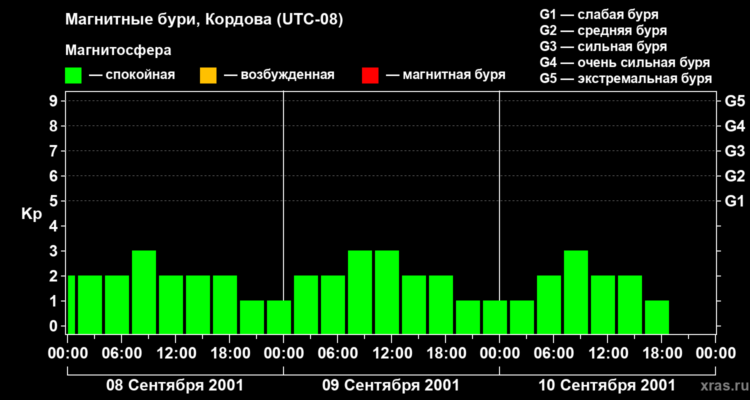 Изменения геомагнитного индекса Kp с 8 по 10 сентября 2001 года для средних широт