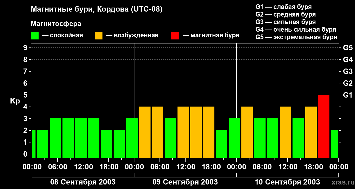 Изменения геомагнитного индекса Kp с 8 по 10 сентября 2003 года для средних широт