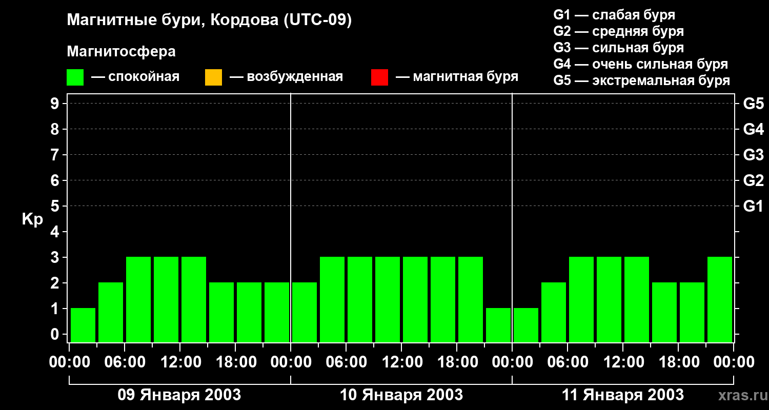 Изменения геомагнитного индекса Kp с 9 по 11 января 2003 года для средних широт