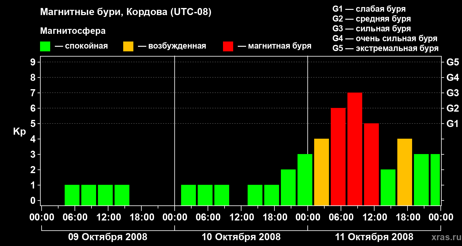 Изменения геомагнитного индекса Kp с 9 по 11 октября 2008 года для средних широт