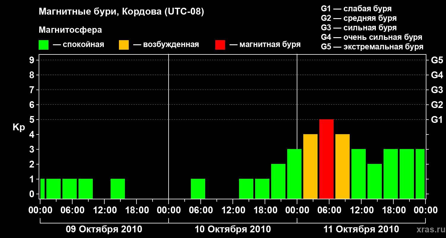 Изменения геомагнитного индекса Kp с 9 по 11 октября 2010 года для средних широт
