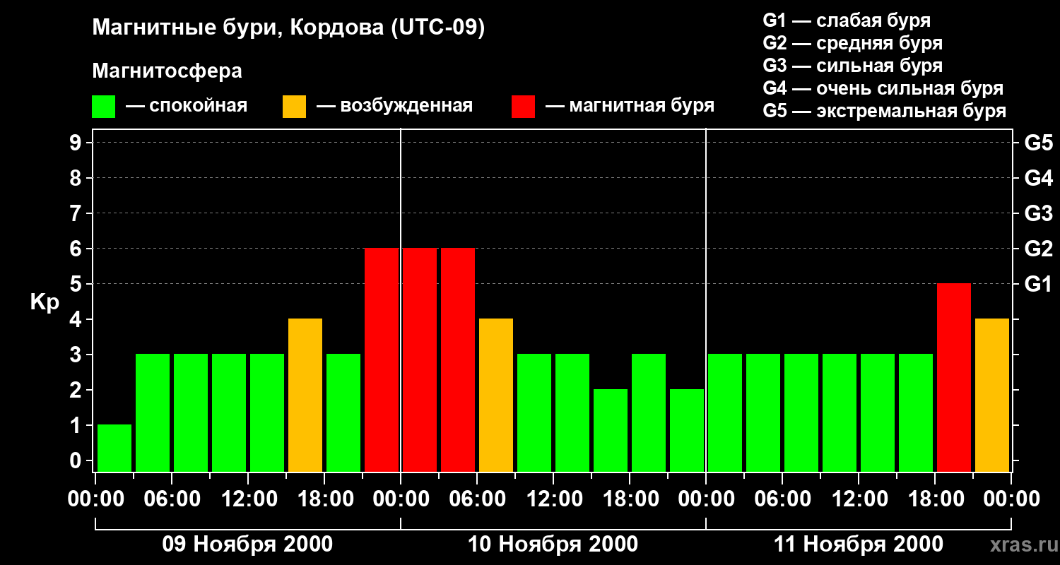 Изменения геомагнитного индекса Kp с 9 по 11 ноября 2000 года для средних широт