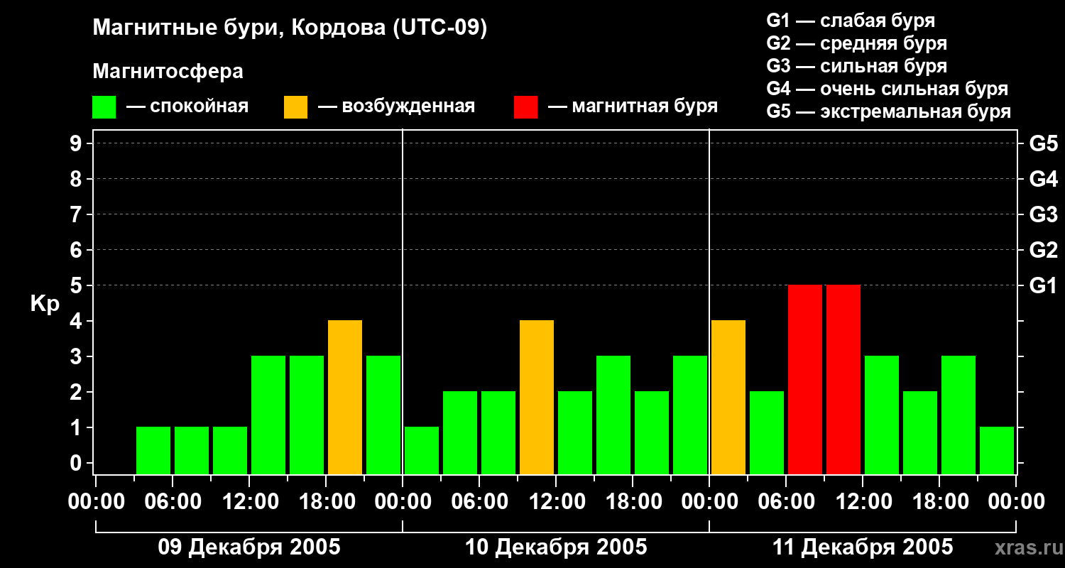 Изменения геомагнитного индекса Kp с 9 по 11 декабря 2005 года для средних широт