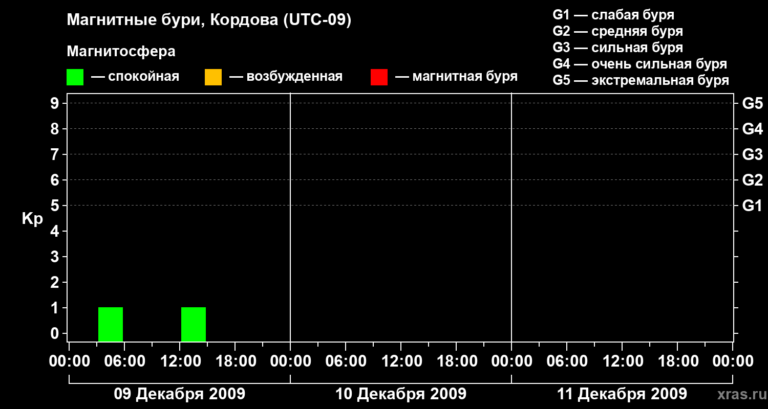 Изменения геомагнитного индекса Kp с 9 по 11 декабря 2009 года для средних широт