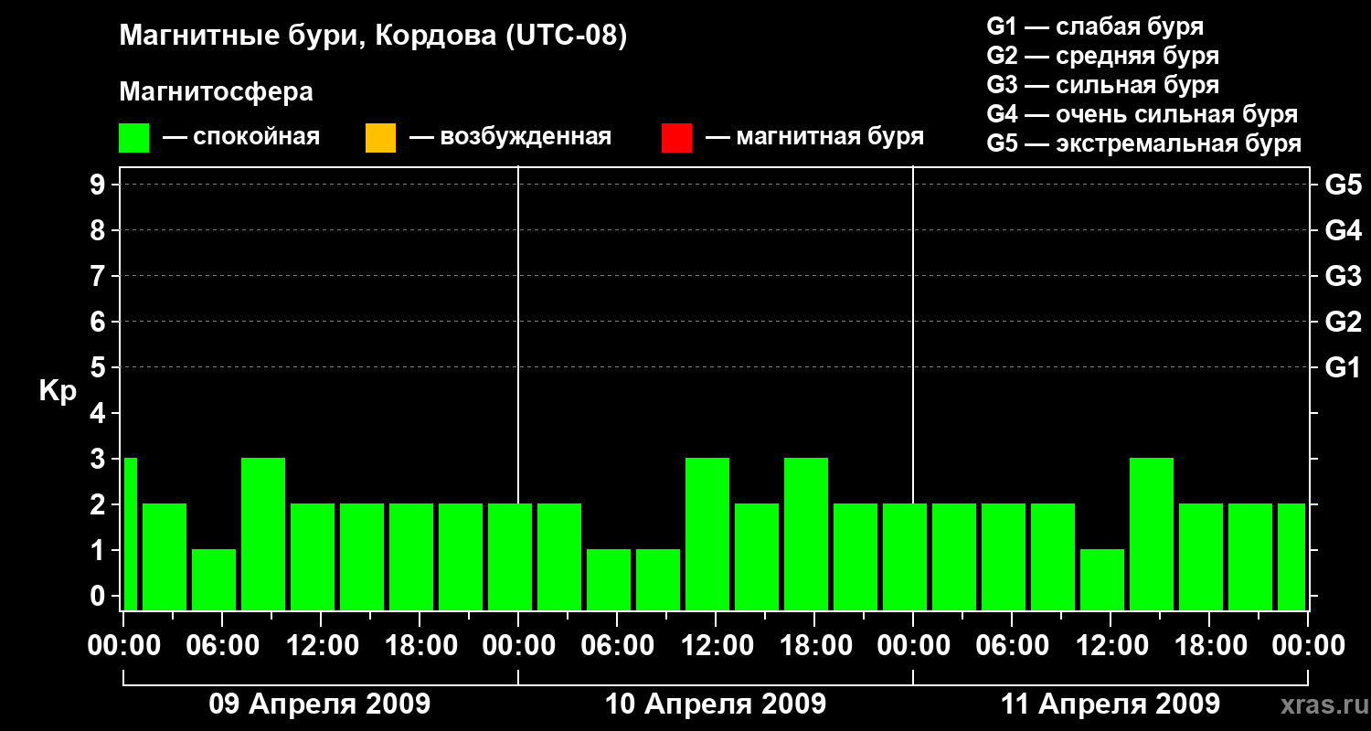 Изменения геомагнитного индекса Kp с 9 по 11 апреля 2009 года для средних широт