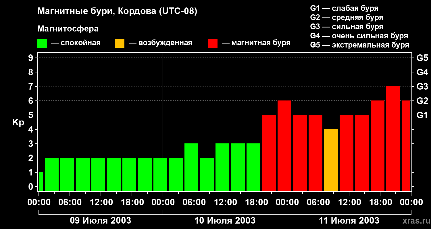 Изменения геомагнитного индекса Kp с 9 по 11 июля 2003 года для средних широт