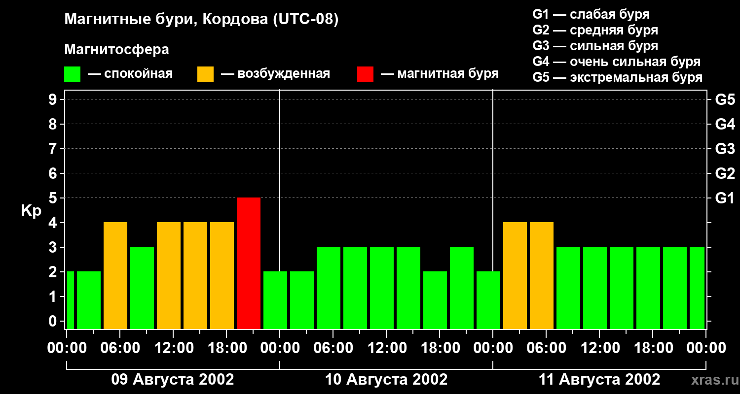 Изменения геомагнитного индекса Kp с 9 по 11 августа 2002 года для средних широт
