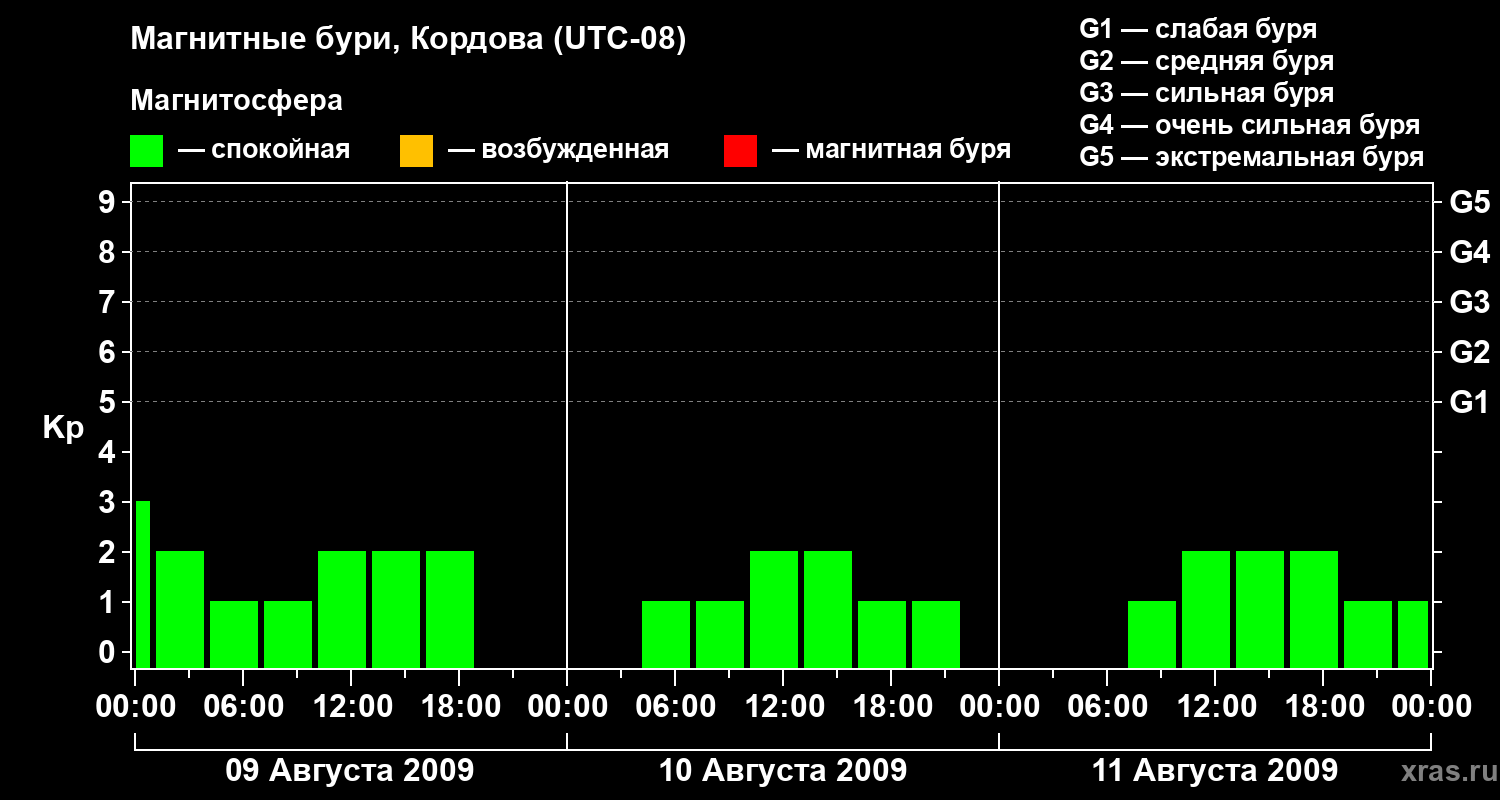 Изменения геомагнитного индекса Kp с 9 по 11 августа 2009 года для средних широт