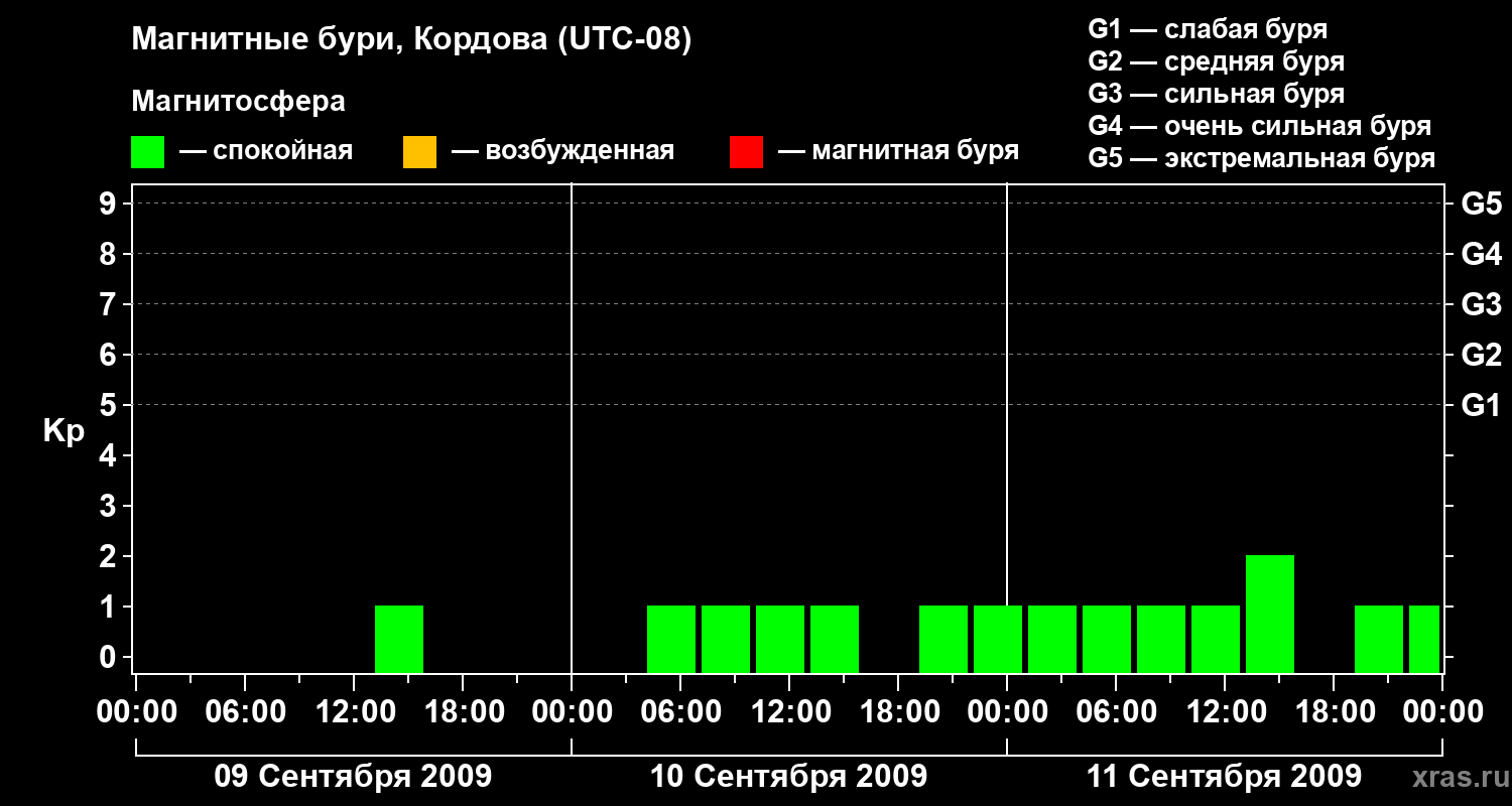 Изменения геомагнитного индекса Kp с 9 по 11 сентября 2009 года для средних широт