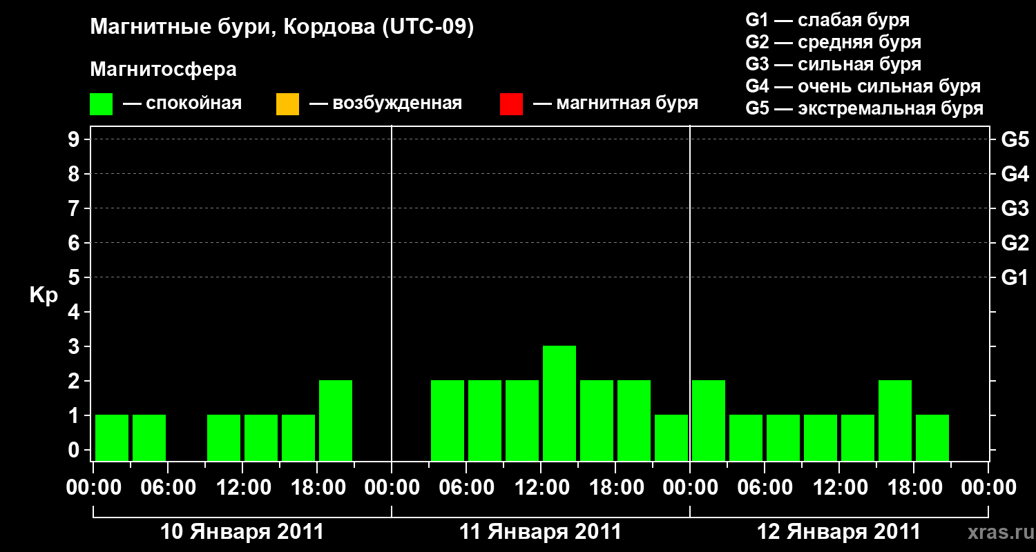 Изменения геомагнитного индекса Kp с 10 по 12 января 2011 года для средних широт