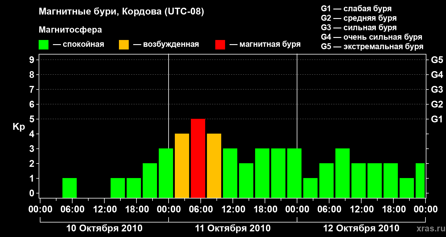 Изменения геомагнитного индекса Kp с 10 по 12 октября 2010 года для средних широт