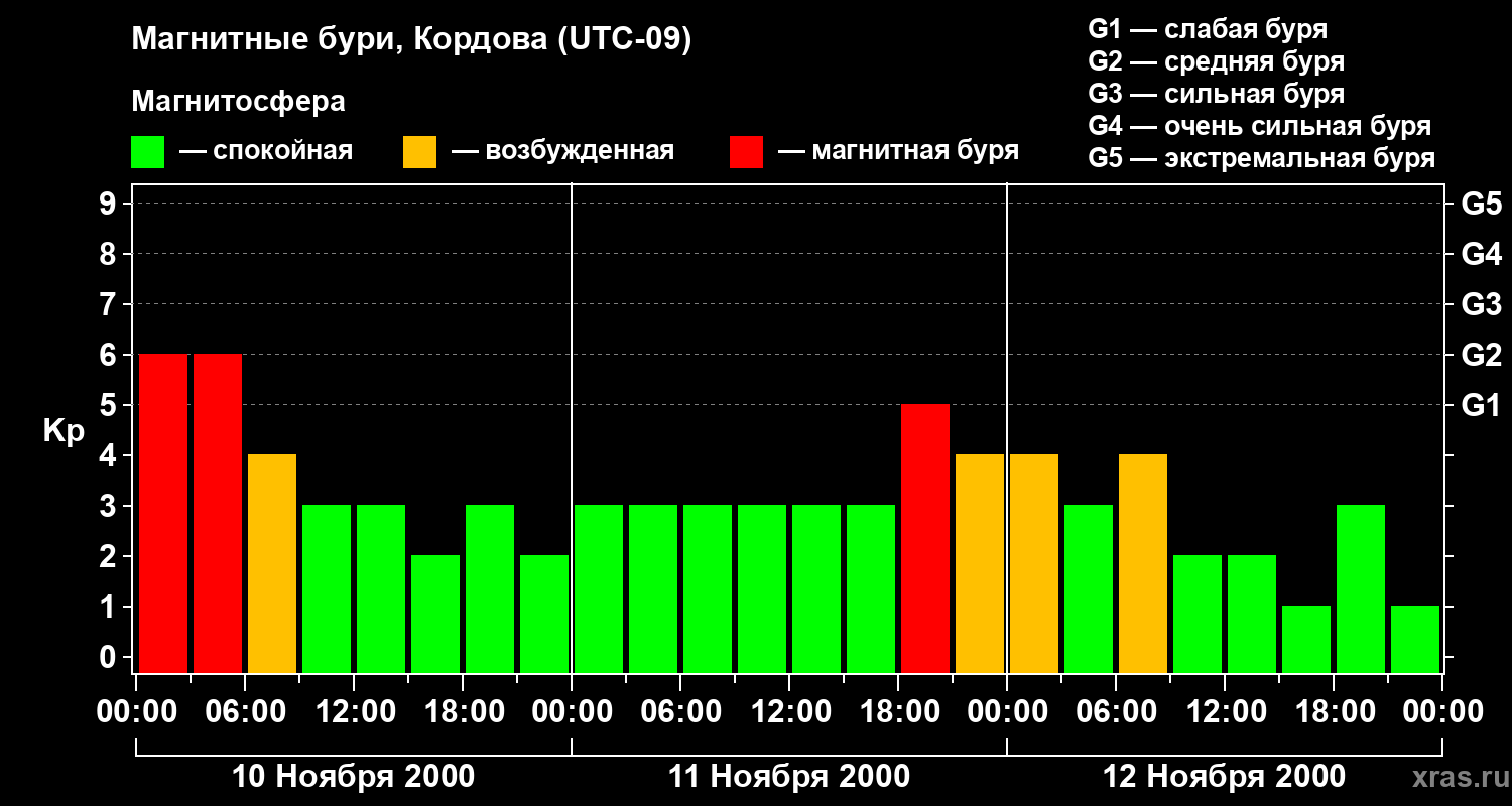 Изменения геомагнитного индекса Kp с 10 по 12 ноября 2000 года для средних широт