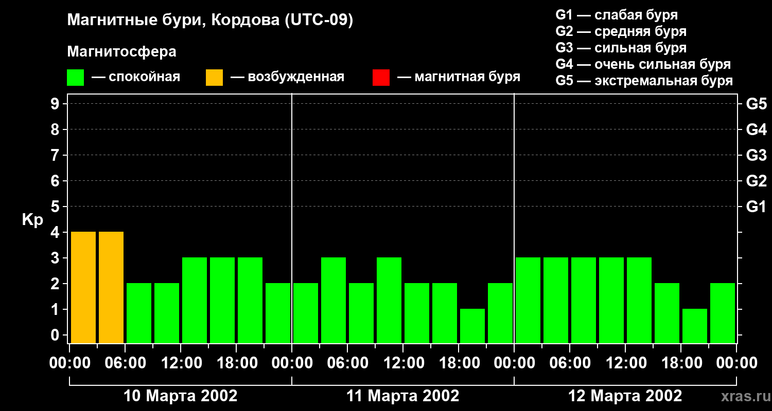 Изменения геомагнитного индекса Kp с 10 по 12 марта 2002 года для средних широт