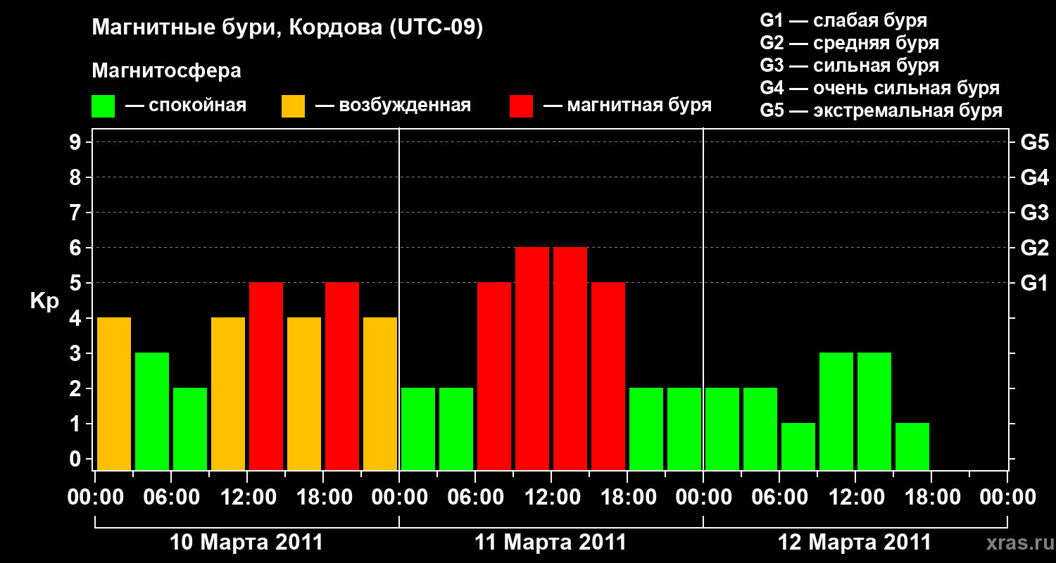 Изменения геомагнитного индекса Kp с 10 по 12 марта 2011 года для средних широт