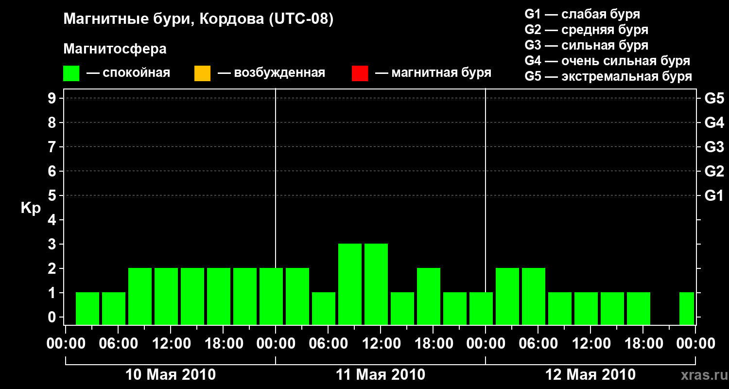 Изменения геомагнитного индекса Kp с 10 по 12 мая 2010 года для средних широт
