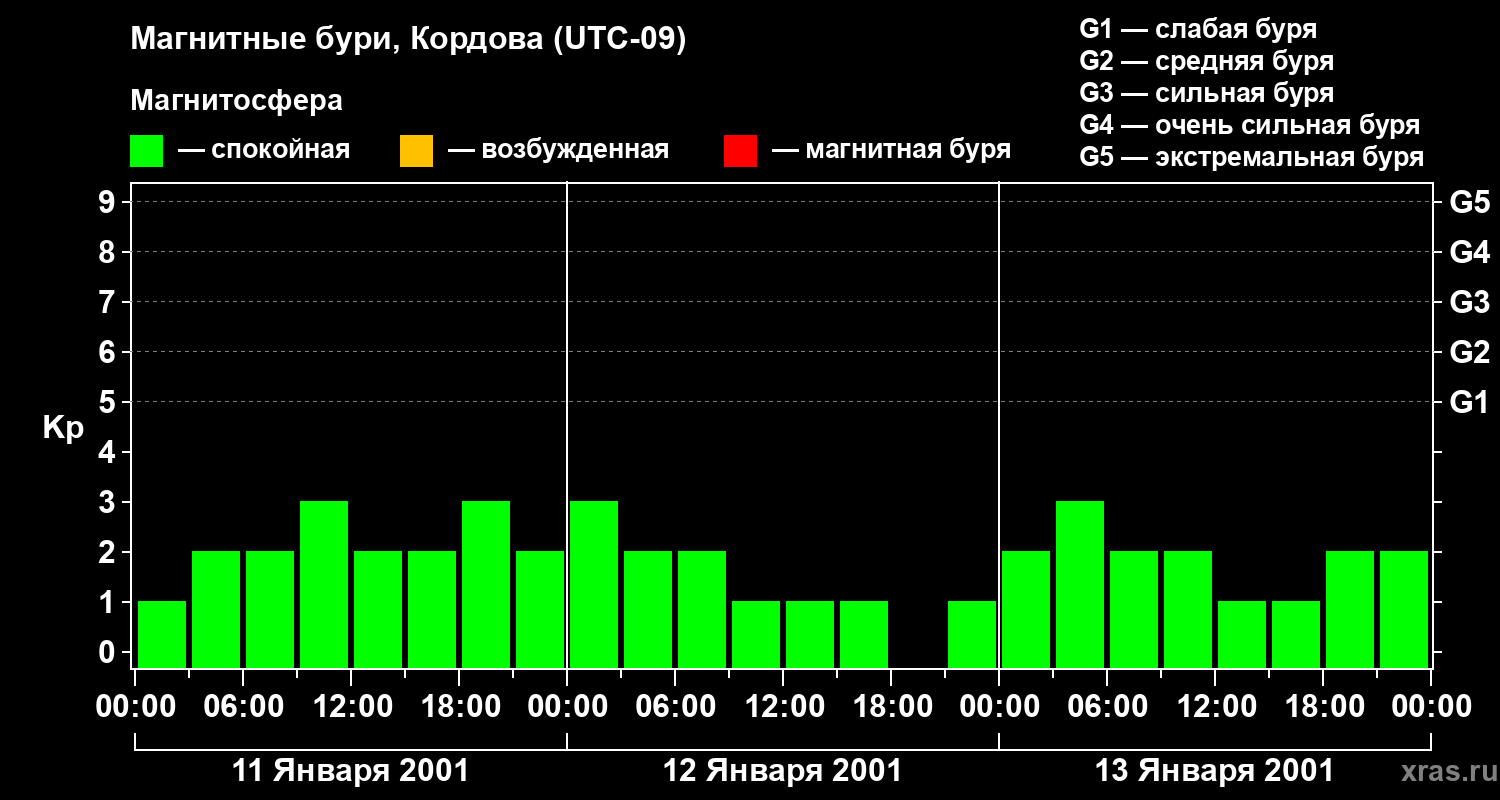Изменения геомагнитного индекса Kp с 11 по 13 января 2001 года для средних широт