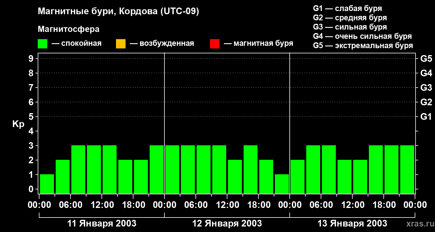 Изменения геомагнитного индекса Kp с 11 по 13 января 2003 года для средних широт