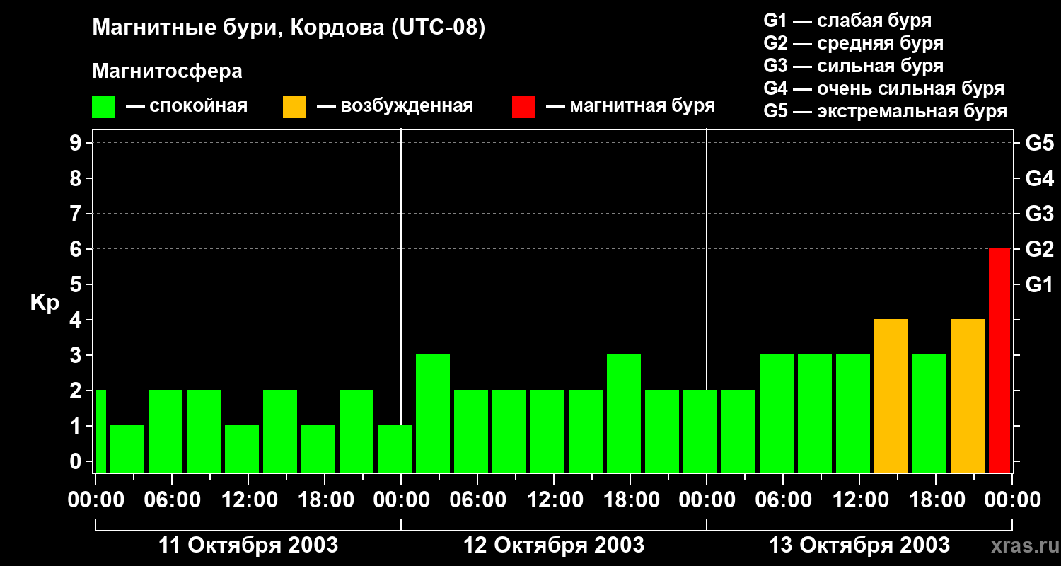 Изменения геомагнитного индекса Kp с 11 по 13 октября 2003 года для средних широт