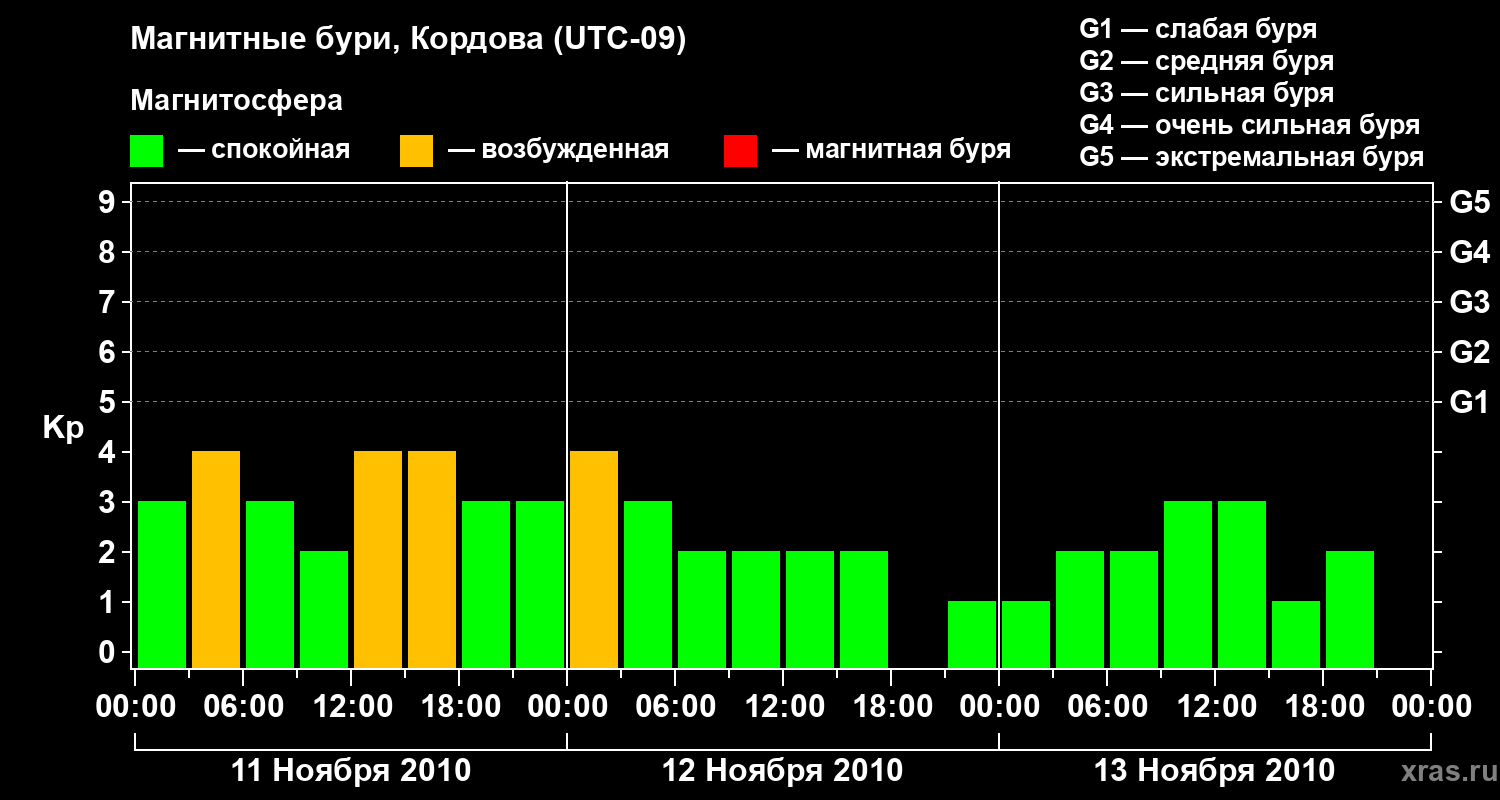 Изменения геомагнитного индекса Kp с 11 по 13 ноября 2010 года для средних широт