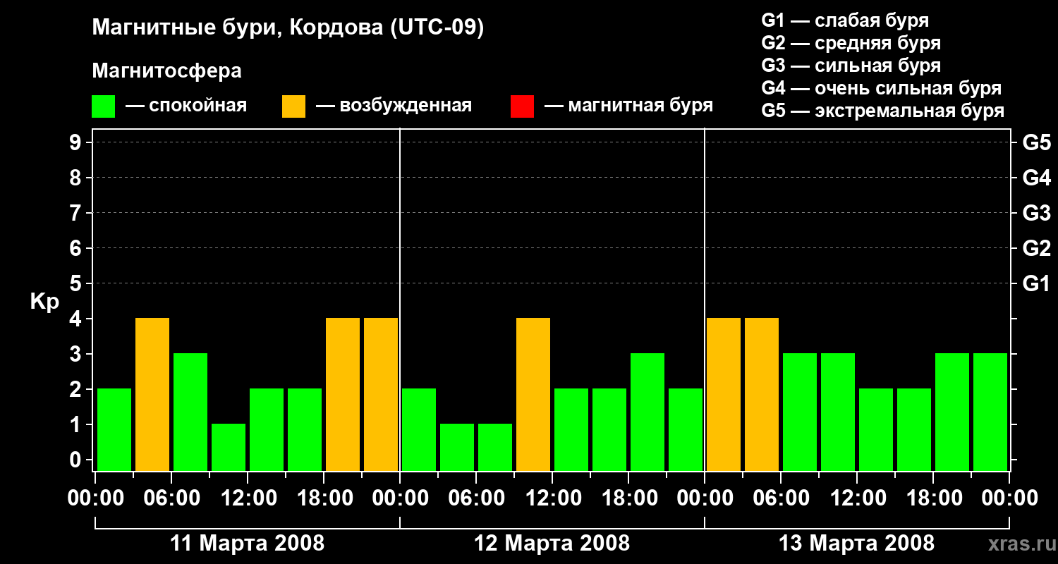 Изменения геомагнитного индекса Kp с 11 по 13 марта 2008 года для средних широт