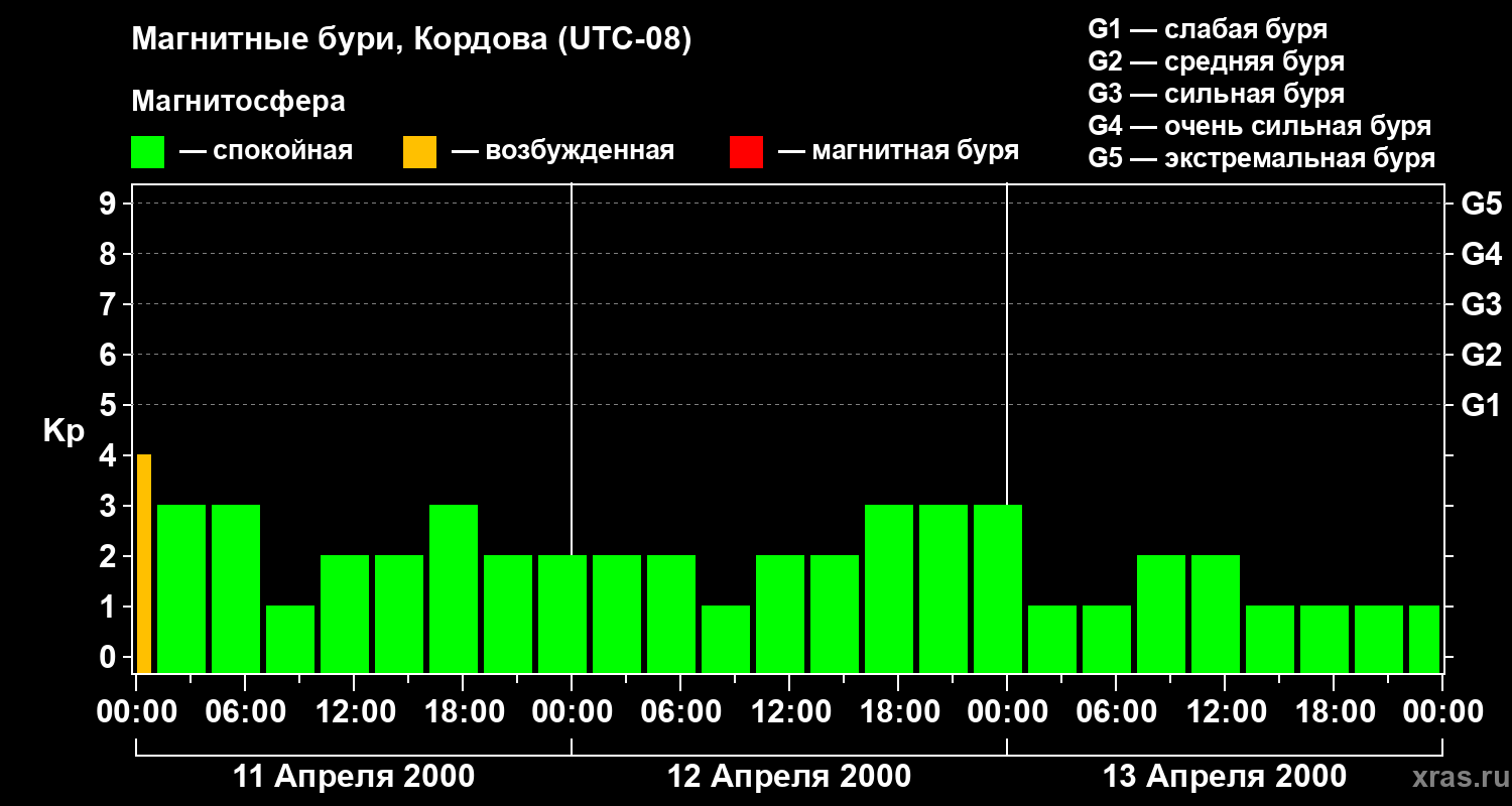 Изменения геомагнитного индекса Kp с 11 по 13 апреля 2000 года для средних широт