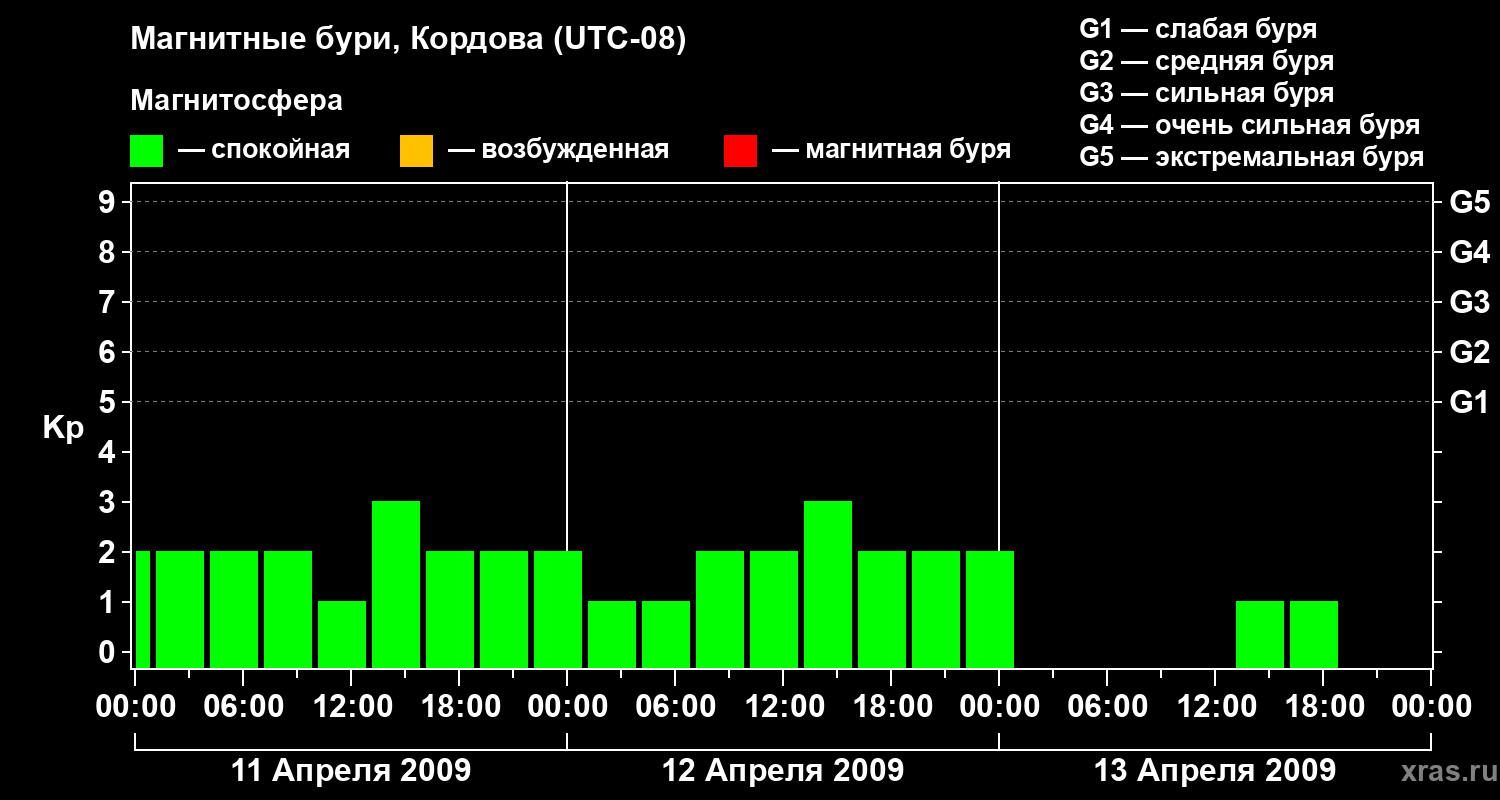 Изменения геомагнитного индекса Kp с 11 по 13 апреля 2009 года для средних широт