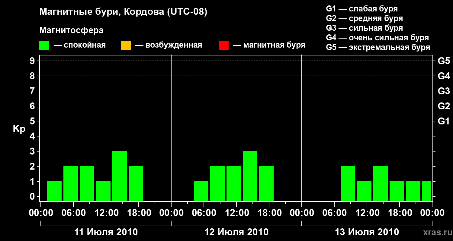 Изменения геомагнитного индекса Kp с 11 по 13 июля 2010 года для средних широт