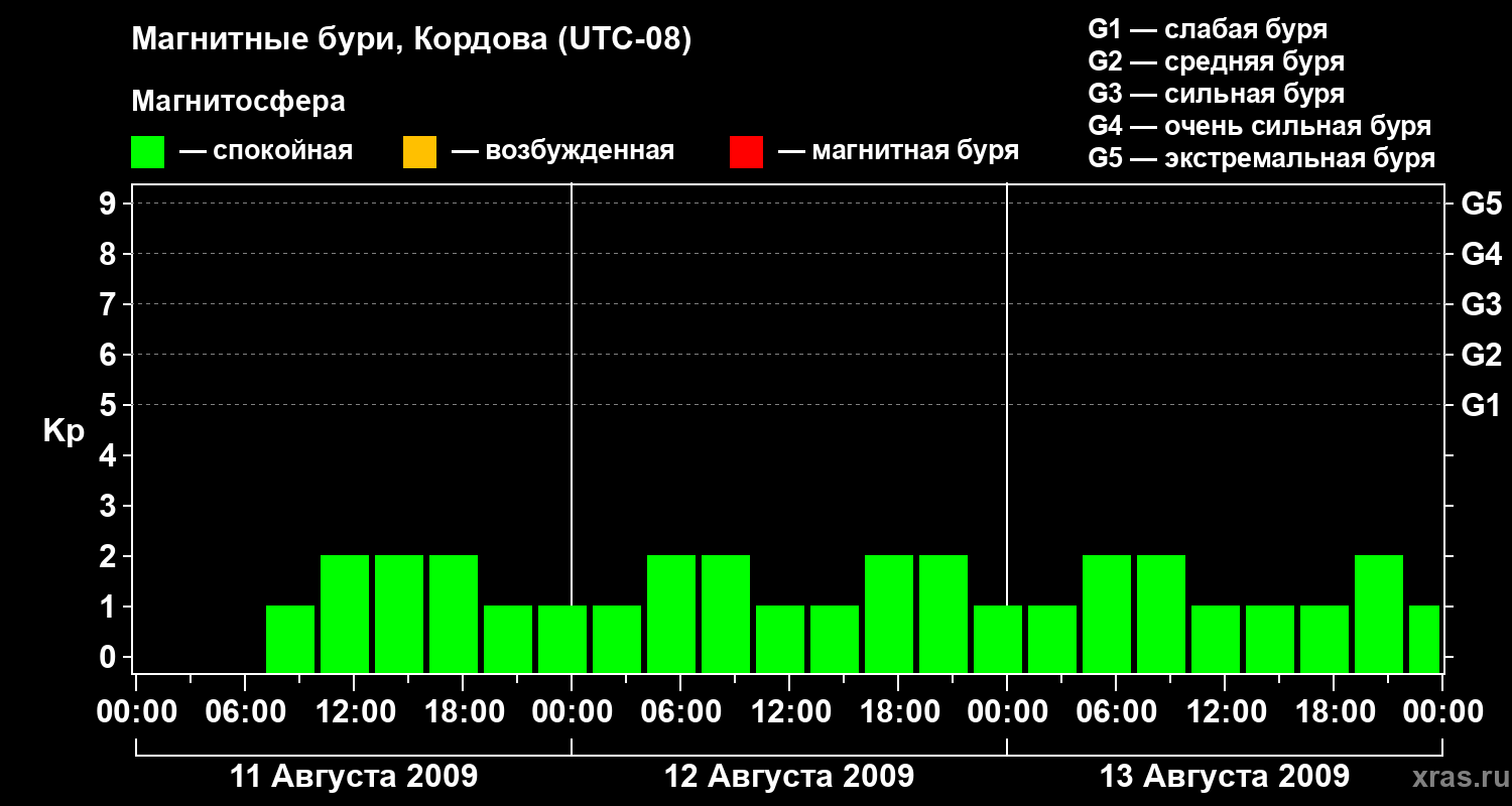 Изменения геомагнитного индекса Kp с 11 по 13 августа 2009 года для средних широт