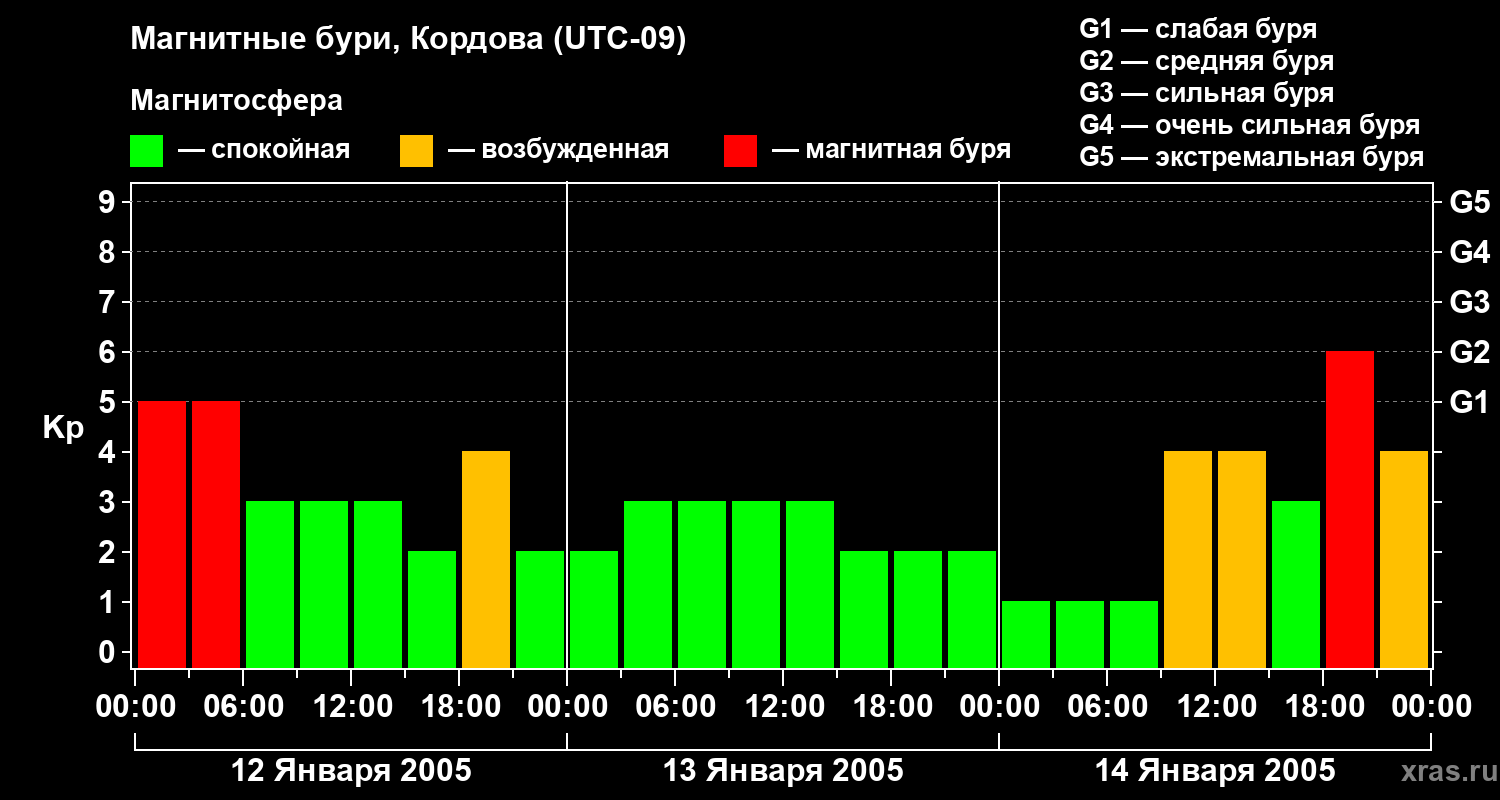 Изменения геомагнитного индекса Kp с 12 по 14 января 2005 года для средних широт