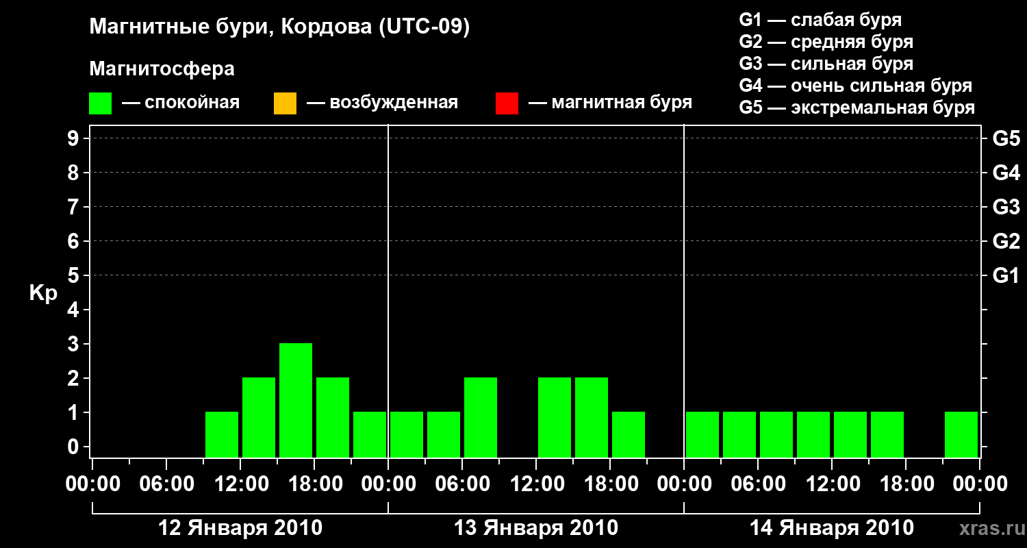 Изменения геомагнитного индекса Kp с 12 по 14 января 2010 года для средних широт