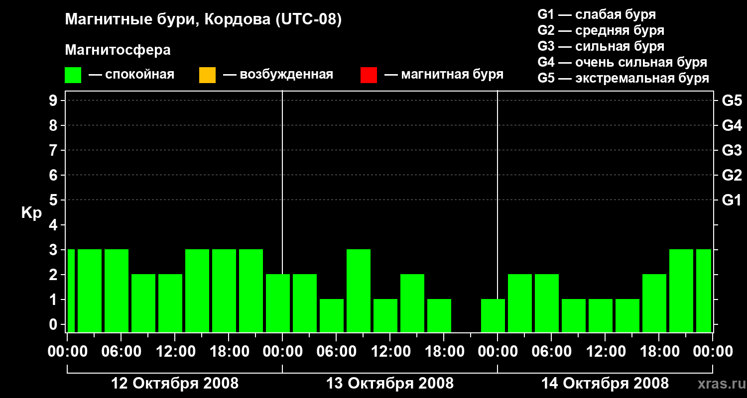 Изменения геомагнитного индекса Kp с 12 по 14 октября 2008 года для средних широт