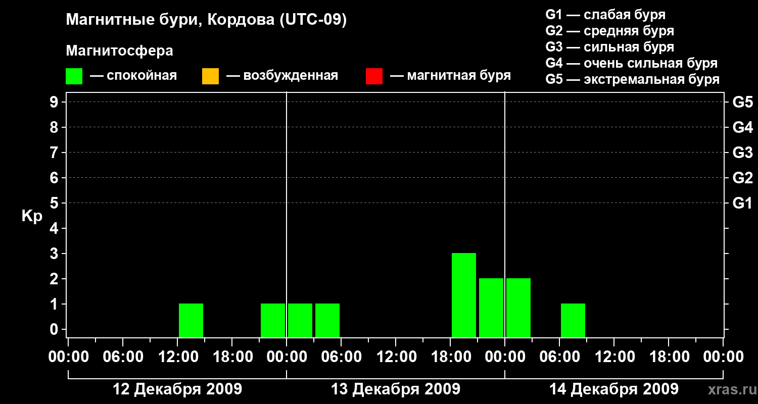 Изменения геомагнитного индекса Kp с 12 по 14 декабря 2009 года для средних широт