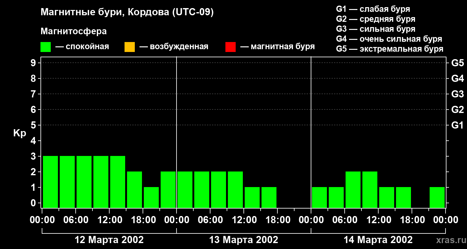 Изменения геомагнитного индекса Kp с 12 по 14 марта 2002 года для средних широт