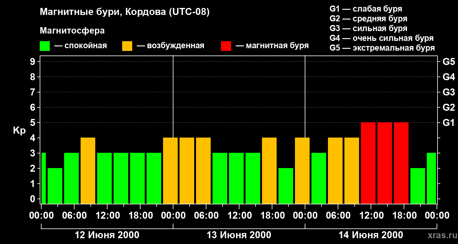 Изменения геомагнитного индекса Kp с 12 по 14 июня 2000 года для средних широт