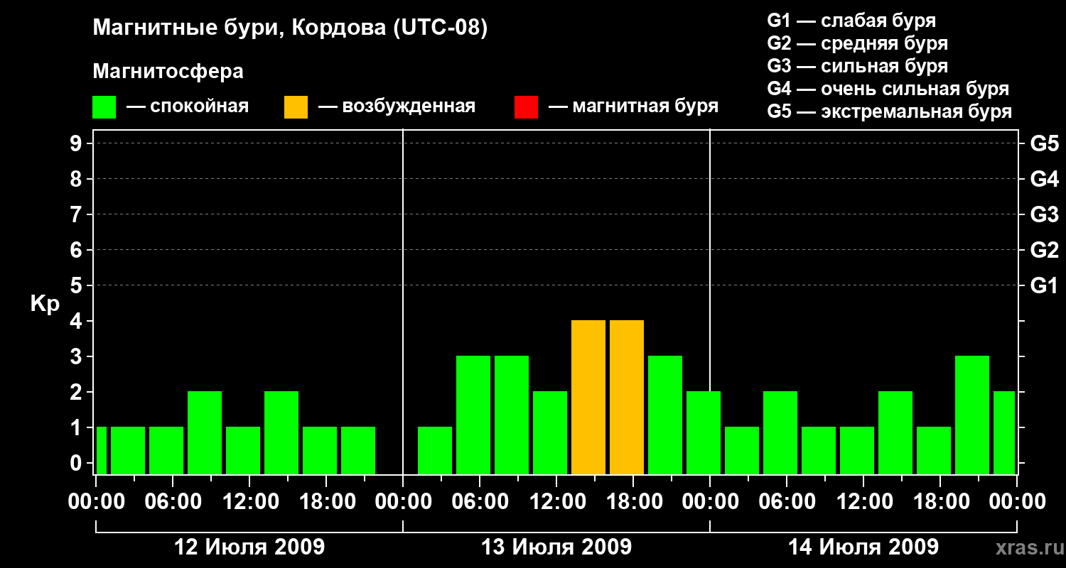 Изменения геомагнитного индекса Kp с 12 по 14 июля 2009 года для средних широт